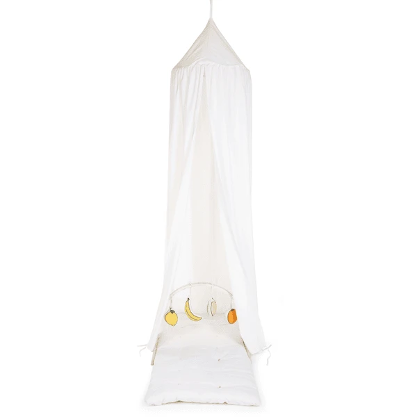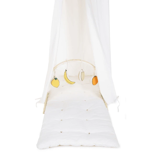 Pero aún hay más: el toldo se presenta en un bonito conjunto con una alfombra de juego. Puede fijar la alfombra de juego al toldo con prácticos hilos. De esta forma, podrás crear la tienda de campaña más bonita y chula.