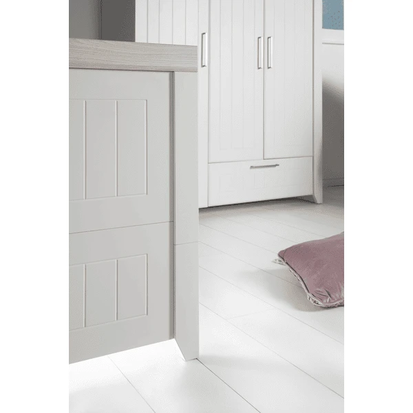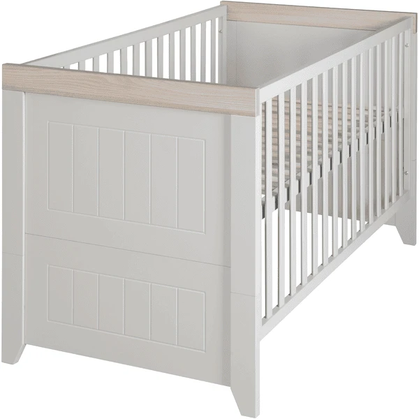 Cuando su bebé sea mayor, la cuna combinada puede convertirse en una cama Junior con los lados de conversión disponibles por separado. El cabecero y el piecero de la cuna combinada con secciones fresadas de alta calidad y modern en tacos con pie cónico pueden dividirse. Cuando se convierte en una cama Junior , se utilizan las dos mitades superiores del cabecero y el piecero para crear un nuevo aspecto en la habitación de los niños. La cuna combinada «Helene» puede utilizarse hasta que el niño tenga 7 años (o hasta un peso corporal de 50 kg). La cama infantil roba y Junior tiene una superficie de reposo de 70 x 140 cm. Si desea convertir la cuna en una cama de cuatro postes, nuestros conjuntos de cuna de 4 piezas roba , compuestos por almohada, manta, dosel y nido, son ideales.